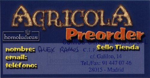 El sistema de preorder consiste en movilizar a la gente interesada en la edición (o reedición) de un juego y que estos lo paguen por adelantado para aminorar a la empresa editorial los riesgos de la producción. Cuando se alcanza un número estimado interesante de solicitudes para que salga rentable para todos se comienza la producción. Dadas las expectativas que Agricola viene generando desde la última feria de Essen… Tiene pinta de salir adelante rápido y bien.